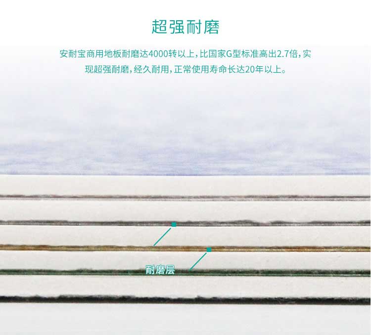 安耐寶pvc地板耐磨達(dá)4000轉(zhuǎn)以上,比國(guó)家G型標(biāo)準(zhǔn)高出2.7倍,實(shí)現(xiàn)超強(qiáng)耐磨,經(jīng)久耐用,正常使用壽命長(zhǎng)達(dá)20年以上。