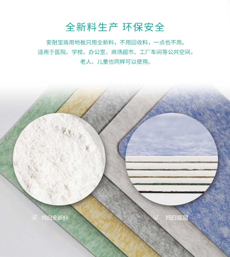 安耐寶pvc地板只用全新料,不用回收料,一點(diǎn)也不用。適用于醫(yī)院、學(xué)校、辦公室、商場(chǎng)超市、工廠車間等公共空間老人、兒童也同樣可以使用。