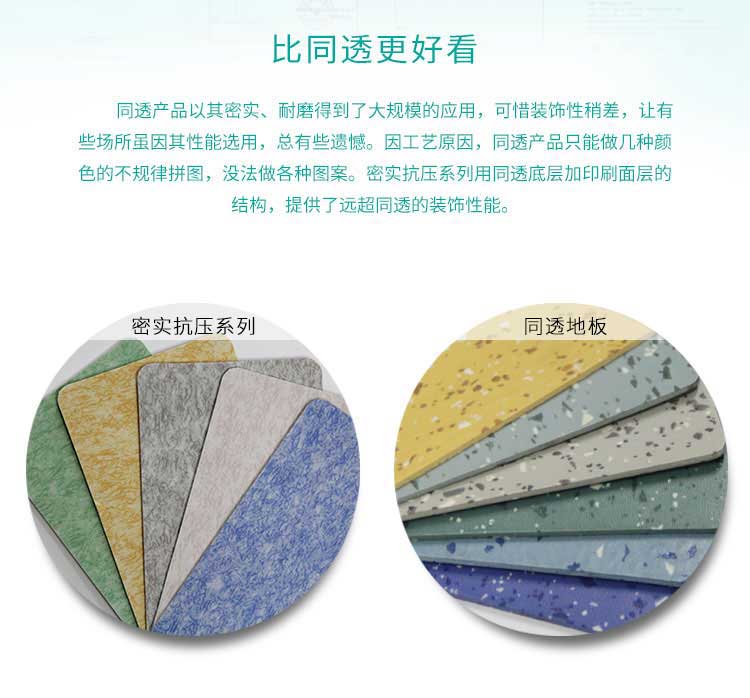 密實(shí)抗壓系列采用了生產(chǎn)同質(zhì)透芯地板的工藝來(lái)生產(chǎn)底層,用復(fù)合工藝加工面層,揚(yáng)長(zhǎng)棄短,開(kāi)創(chuàng)了全新品類。