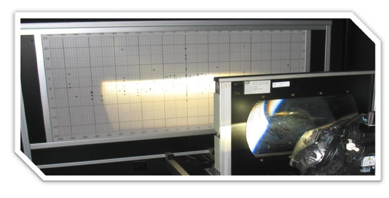 測(cè)試前照燈配光特性的方法,按有關(guān)國(guó)家標(biāo)準(zhǔn)規(guī)定,是在汽車前方25m(信號(hào)燈10m)處放置一屏幕,測(cè)試近光燈在屏幕上的照度分布,如下圖: