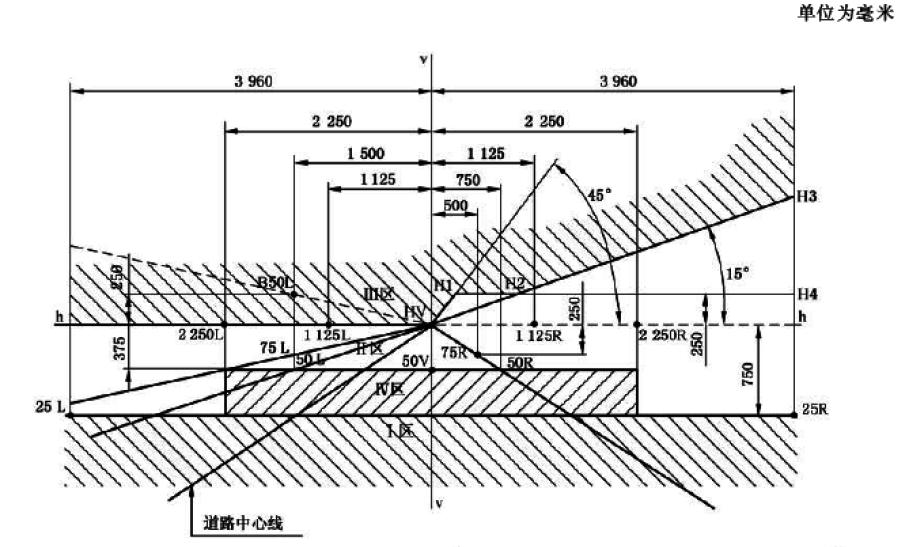 圖中HV點(diǎn)對(duì)應(yīng)前照燈的中心點(diǎn),v線對(duì)應(yīng)右車道中心線。圖中劃分了I、Ⅱ、Ⅲ、Ⅳ區(qū),對(duì)應(yīng)于路面和前方的不同位置,還標(biāo)出了若干測(cè)試點(diǎn),如B50L