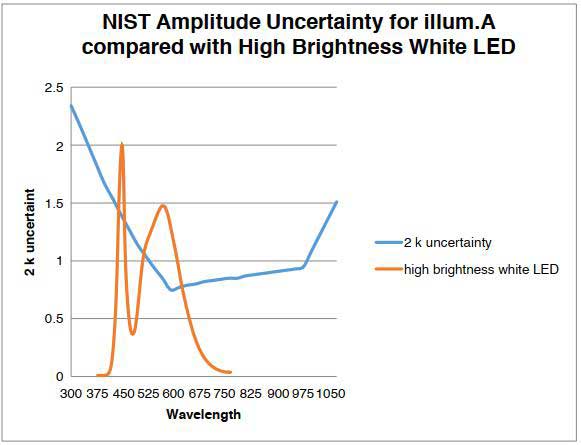 這造成在使用A光源作為校準(zhǔn)源時(shí)產(chǎn)生不確定性。 大多數(shù)設(shè)備都以A光源為參考,但是典型的非A光源的光源的測量不確定性相對(duì)較高,并且儀器間一致性也會(huì)受到影響。 因此,大多數(shù)電子顯示測量都不是基于A光源的。