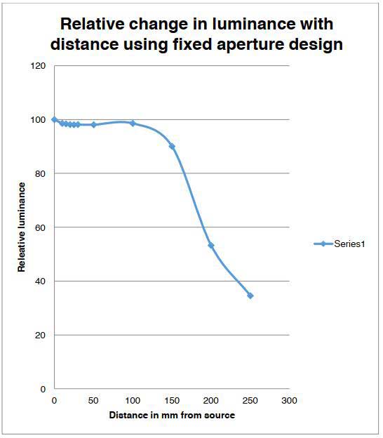 Photo Research的固定孔徑附件在測量設(shè)備的較大運(yùn)動(dòng)范圍內(nèi)可以變化很小。 當(dāng)被測光源不再充滿透鏡的入射光瞳時(shí),測得亮度會(huì)快速變化。但經(jīng)過校準(zhǔn)在2-6mm的孔徑之間,亮度幾乎沒有變化。