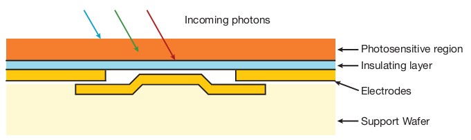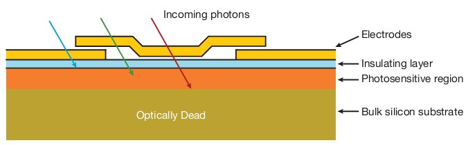 量子效率主要由芯片的光敏硅層吸收光電子的能力所決定,而這層光敏層,亦稱擴(kuò)散區(qū)。僅在該區(qū)域中,光子轉(zhuǎn)化成電子-空穴對(duì),并由電場(chǎng)禁錮在像素中,然后電荷再依序被讀出。