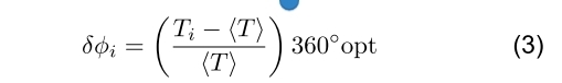 為了評(píng)估上述每種效應(yīng)對(duì)斬波器抖動(dòng)的影響,我們收集了 N 個(gè)周期的光信號(hào),并將測(cè)量的周期繪制為時(shí)間的函數(shù),以及所有測(cè)量值的直方圖。 我們不是以周期為單位繪制(秒),我們是以光學(xué)相位(°opt)為單位進(jìn)行繪制。每個(gè)測(cè)量周期 Ti 均轉(zhuǎn)換為相位誤差 δψi,如下所示