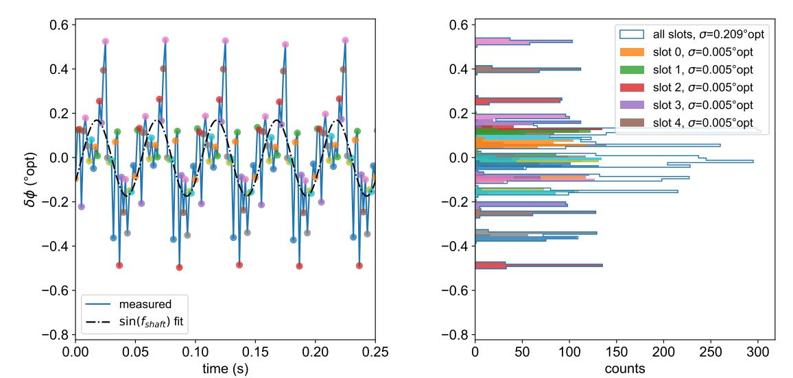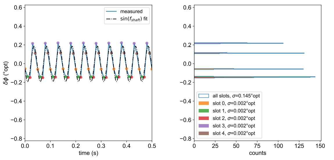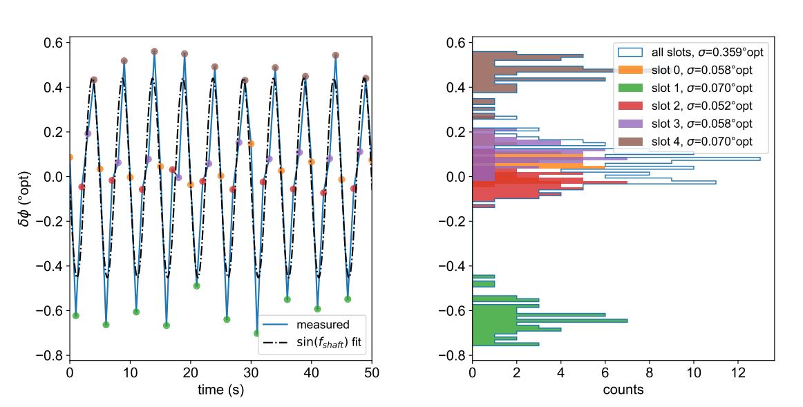 對(duì)于 n 槽葉片,每第 n 個(gè)周期測(cè)量都是對(duì)同一槽的重復(fù)測(cè)量。因此,我們?yōu)榕c該葉片的 5 個(gè)槽相對(duì)應(yīng)的周期測(cè)量值分配不同的顏色。以槽 1 為例(綠色)。它的平均周期誤差約為−0.65°opt。這意味著標(biāo)記槽位 1 周期結(jié)束的邊緣比預(yù)期早 0.65°opt。非確定性抖動(dòng)將綠色分布的寬度設(shè)置為僅為 0.070°opt,因此相位誤差從一轉(zhuǎn)到另一轉(zhuǎn)的再現(xiàn)性非常好,并且由確定性誤差主導(dǎo)。簡(jiǎn)單地說(shuō),對(duì)于單個(gè)槽位,相位誤差的確定性源確定平均值,而非確定性源確定抖動(dòng)(標(biāo)準(zhǔn)偏差)。