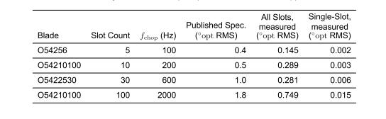 表1中列出了實(shí)測(cè)性能和已發(fā)布規(guī)格的表格比較。為簡(jiǎn)單起見,為每個(gè)葉片選擇單個(gè)斬波頻率。顯示了“所有槽”和“單槽”抖動(dòng)值,但由于“所有槽”測(cè)量與大多數(shù)斬波實(shí)驗(yàn)相關(guān),因此應(yīng)將該值與已發(fā)布的規(guī)格進(jìn)行比較。