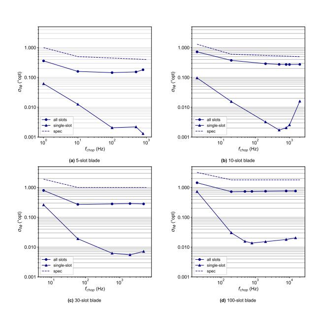 有幾個(gè)來(lái)源會(huì)影響斬波光束上的整體抖動(dòng)??梢允请S機(jī)的或確定性的,并且隨著機(jī)械旋轉(zhuǎn)而重復(fù),如齒槽扭矩、葉片缺陷和葉片的非同心安裝等情況。一些確定性來(lái)源(齒槽效應(yīng)和同心度)將與 Φ軸(或其諧波)大致呈正弦關(guān)系,而其他來(lái)源(葉片缺陷)可以作為軸方向的函數(shù)隨機(jī)分散。通常,以可用的最高軸速度進(jìn)行斬波有利于消除齒槽扭矩引起的誤差。同時(shí),葉片缺陷和同心度會(huì)產(chǎn)生與頻率無(wú)關(guān)的誤差。為了最大限度地減少同心度誤差,在將葉片安裝到輪轂上時(shí)應(yīng)注意不要引入徑向偏移。最后,由于葉片制造誤差通常具有固定的橫向尺寸,因此這些誤差將對(duì)較高槽數(shù)的葉片產(chǎn)生更顯著的影響,因此使用盡可能少的槽數(shù)也是有利的。