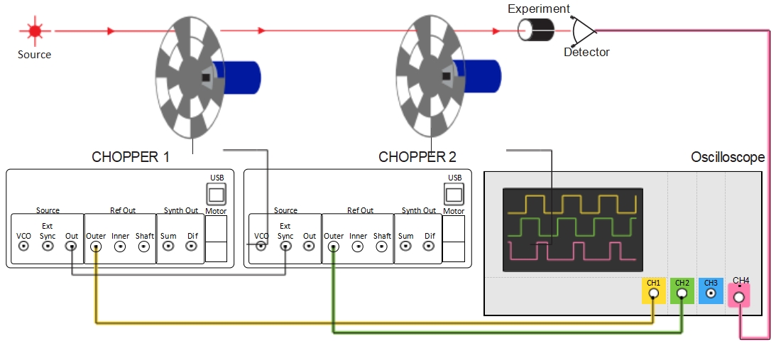 圖4: .使用示波器對(duì)兩個(gè)SR542光學(xué)斬波器進(jìn)行同步和相位對(duì)準(zhǔn)的示意圖。斬波器1做為主時(shí)鐘,因此其Source Output與斬波器2的Ext Sync Input相連。兩個(gè)斬波器的Outer Slots Reference Output以及來(lái)自光電探測(cè)器的雙斬波光束信號(hào)均連接到示波器上。