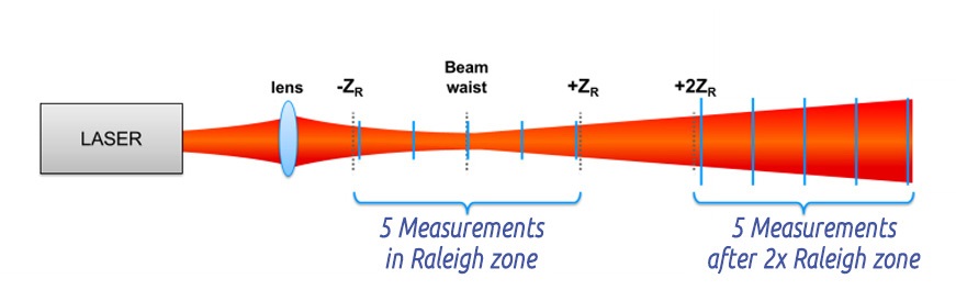 ISO規(guī)范了一種從一組光束直徑測量值中計算M²因子的方法,以最大限度地減小誤差。在測量過程中,激光束首先需要用高光學(xué)質(zhì)量、已知焦距的透鏡聚焦。然后,使用陣列探測器或掃描狹縫輪廓儀在光束的不同位置測量光束寬度。