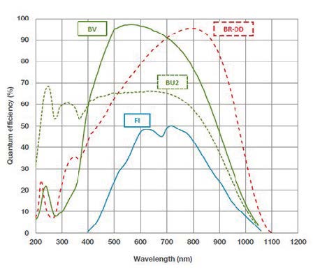 FI:前感光CCD BV:背感光,可見(jiàn)波段優(yōu)化 BU2:背感光,紫外增強(qiáng)250nm 優(yōu)化 BR-DD:背感光深耗盡CCD。帶有消除近紅外波段的etalon 鍍膜 |