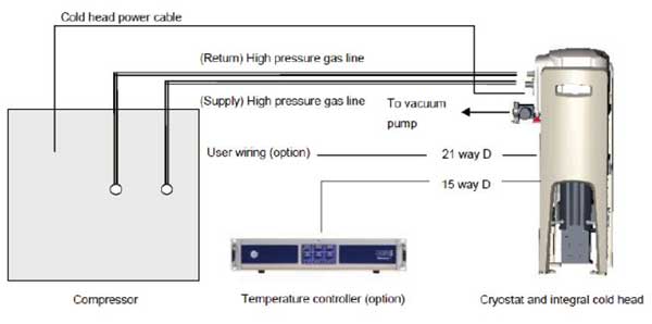 主要工作原理:Optistat Dry 干式制冷機(jī)采用GM 制冷機(jī),主要部件有冷頭、壓縮機(jī)以及高壓氦氣管。這三個(gè)部件組成了一個(gè)閉合的氦氣循環(huán)回路,可以產(chǎn)生制冷功率。冷頭是GM 制冷機(jī)循環(huán)的場所,通過兩根高壓氦氣管以及供電引線連接到壓縮機(jī)。其中一根高壓氦氣管供給高壓氦氣,另一根回收膨脹后的低壓氦氣。壓縮機(jī)提供必需的高壓氦氣流量來提供足夠的制冷功率。
