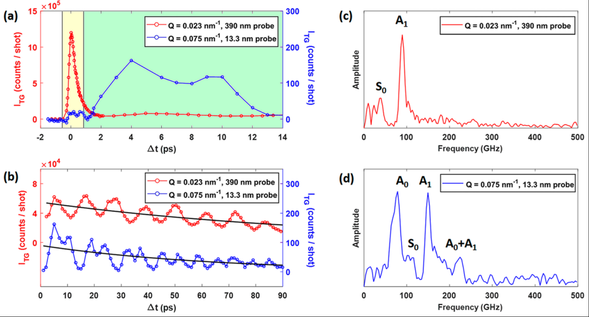 納米尺度的材料特性探測(cè),必須關(guān)注兩個(gè)參數(shù):樣品尺寸(b,目前可以控制在亞納米尺度)和所研究現(xiàn)象的特征波矢(Q)[ACS Appl. Nano Mater. 2019, 2: 5132−5139]。此前在微米長度尺度上,使用光學(xué)技術(shù)(例如熱反射和光學(xué)瞬態(tài)光柵TG)已經(jīng)報(bào)道了其傳熱過程與擴(kuò)散行為的偏差,但是光學(xué)TG研究?jī)H限于相對(duì)較低的 Q 值(≈1μm−1)。為了探索亞微米厚樣品中涵蓋從長波到體響應(yīng)的轉(zhuǎn)變的Q·b范圍,需要EUV TG分析方可利用的更大Q值范圍。自由電子激光 (FEL) 提供了高亮度的 EUV 脈沖,從而可以將非線性光學(xué)技術(shù)擴(kuò)展到更短的波長,其中包括TG光譜。圖1首次用FEL EUV光脈沖產(chǎn)生的瞬態(tài)光柵,結(jié)合一束可見光研究了四波混頻(FWM)的非線性過程,表明了用EUV這種極端光波長產(chǎn)生TG的可行性[Nature, 2015, 520: 205]。