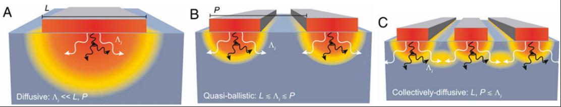 圖3 納米尺度熱傳輸由三個(gè)特征尺度決定[PNAS, 2015, 112(16): 4846–4851]:熱源尺寸 L、熱源間距 P 以及載熱聲子的 MFP Λi。(A) 當(dāng)所有 MFP 都小于 L 時(shí),散熱完全來自擴(kuò)散效應(yīng)。(B) 當(dāng) L 收縮時(shí),長 MFP 聲子呈彈道狀傳播,相對(duì)于擴(kuò)散預(yù)測(cè),散熱速率有所降低,此時(shí)短 MFP 聲子仍保持?jǐn)U散性。(C) 當(dāng) L 和 P 同時(shí)減小,來自相鄰熱源的長 MFP 聲子會(huì)像來自單個(gè)大型熱源一樣相互作用,從而實(shí)現(xiàn)更高效的擴(kuò)散式傳熱。