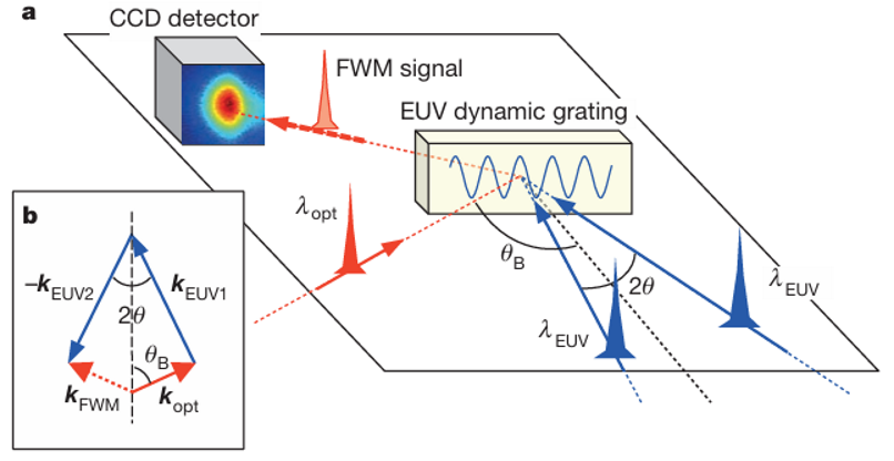 圖1 使用FEL EUV產(chǎn)生TG進(jìn)行四波混頻(FWM)實(shí)驗(yàn)[Nature, 2015, 520: 205]。a、基于 FEL 的 FWM 實(shí)驗(yàn)示意圖,兩束λEUV產(chǎn)生EUV TG,CCD 傳感器放置在 FWM 信號(hào)光束 (kFWM) 的預(yù)期傳播方向上,該方向由“相位匹配”決定(如圖 b 所示;其中 kopt、kEUV1 和 kEUV2 分別為光脈沖和兩束 FEL 脈沖的波矢)。