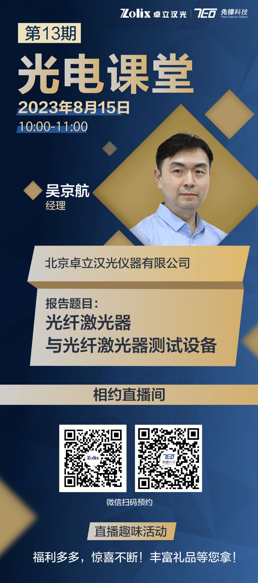 8月15日上午10:00—11:00北京卓立漢光儀器有限公司 業(yè)務發(fā)展部—吳京航經理將為我們帶來光纖激光器與光纖激光器測試設備的介紹,分享最近十年蓬勃發(fā)展的光纖激光器的技術特點,以及我司代理光纖激光器與光纖激光器測試設備。直播期間更有豐富好禮相送,歡迎屆時參加!