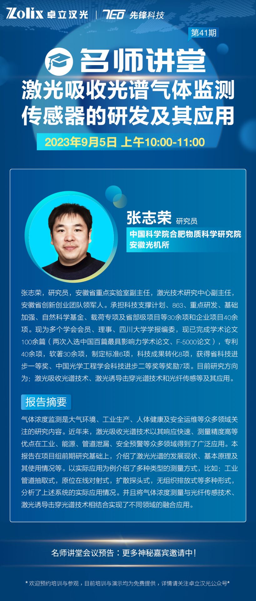 本期先鋒科技隆重邀請到了中國科學(xué)院合肥物質(zhì)科學(xué)研究院 安徽光機所—張志榮研究員,與大家分享自己科研領(lǐng)域的經(jīng)驗和心得體會,他帶來的講座題目是《激光吸收光譜氣體監(jiān)測傳感器的研發(fā)及其應(yīng)用》,希望本次講座能夠為您的科學(xué)研究帶來靈感與助力,推動研究的進展,精彩不容錯過,趕快報名開啟學(xué)習(xí)之旅吧~