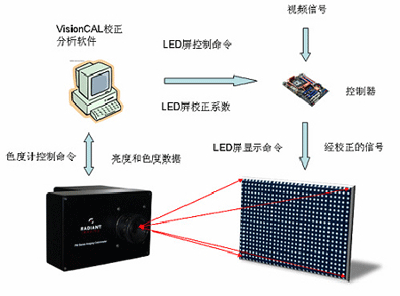 VisionCAL系統(tǒng)使用一架PM系列影像色度計(jì)測(cè)量LED模塊或屏幕中每一顆LED的色度和亮度。在此測(cè)量基礎(chǔ)上,VisionCAL應(yīng)用軟件計(jì)算優(yōu)化每個(gè)LED和LED像素的校正系數(shù)。當(dāng)這些校正系數(shù)運(yùn)用于視頻輸入信號(hào),其結(jié)果是顯示屏在一個(gè)明確的色域范圍內(nèi),表現(xiàn)出均勻的亮度和色度性能。因?yàn)轱@示屏是均勻的和顏色是準(zhǔn)確的,所以整體的視覺(jué)效果得到加強(qiáng)。