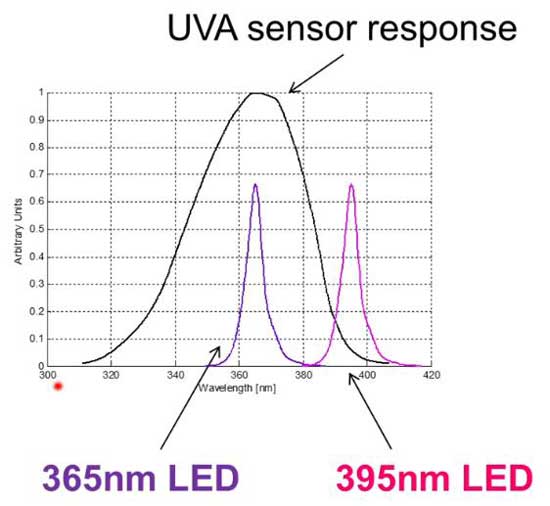 圖1 同一UV光電管對365nm及395nmUV光的響應相差可達90%