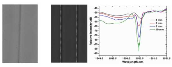 超快激光在透明材料內(nèi)直接刻寫微納結(jié)構(gòu)是近年發(fā)展起來的熱門應(yīng)用。針對(duì)于FBG,超快直寫可以穿透光纖覆層直接在纖芯構(gòu)建折射率結(jié)構(gòu),無需破壞覆層,無需載氫,刻寫的FBG具備耐高溫高濕及長(zhǎng)壽命的特征,而且可以隨意制訂調(diào)制深度、結(jié)構(gòu)尺寸、光柵周期及其變化。同時(shí),更可以靈活的刻寫平面波導(dǎo)光柵、二維光柵、體光柵等立體結(jié)構(gòu),具備非常廣闊的應(yīng)用潛力。