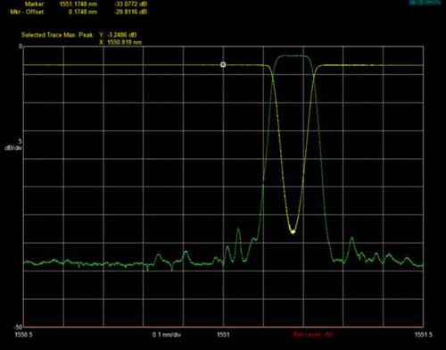 圖2:FBG 的插入損耗IL(黃色)、返回?fù)p耗RL(綠色)測(cè)試,橫軸:0.1nm/div