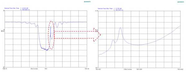 圖3:窄帶寬FBG的插入損耗(IL)測(cè)試。橫軸:50pm/div (左),3pm/div (右)。