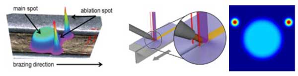 專門為這種工藝訂制的勻化器,可以在主焊的平頂光斑前端兩側(cè)產(chǎn)生兩個(gè)小光斑用于待焊金屬的清洗和加熱,提升釬焊的強(qiáng)度和焊縫的整潔度。