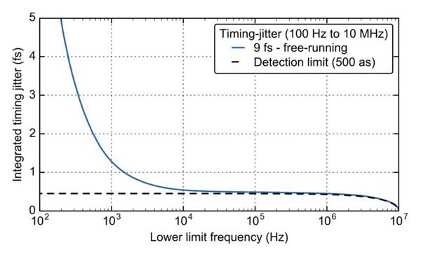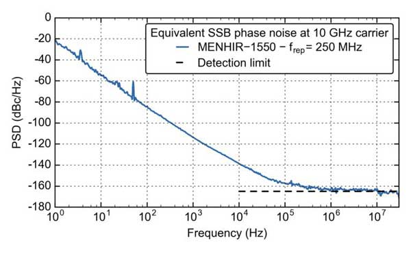 Menhir Photonics 為高精度時基分配提供極低位相噪聲、高可靠度的鎖模激光器。圖1展示了250MHz重復(fù)頻率的MenHIR-1550 的典型位相噪聲。相位噪聲在10GHz載波(40階諧波)上測量。噪聲本底給出的累積時間抖動上限越為500as(阿秒)。