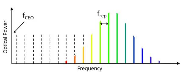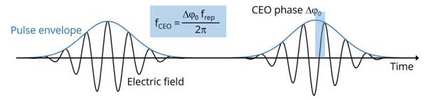 如果激光脈沖 — 不僅僅是脈沖包絡(luò),也包括電場— 序列是嚴格周期性的,所有的梳齒頻率就會簡單的等于激光器重頻的整數(shù)倍。在實際的振蕩器中,電場相對于包絡(luò)通常有一個漂移。相鄰脈沖之間,載波包絡(luò)的峰值與電場峰值之間的相移的差被稱為載波包絡(luò)漂移 (CEO). 在頻域,表現(xiàn)為梳齒頻率與“零位”,即重復(fù)頻率整數(shù)倍之間的差值,稱為載波包絡(luò)漂移頻率 (fCEO) . 如果“重復(fù)頻率” frep 及“載波包絡(luò)漂移頻率” fCEO 已知,則所有梳齒頻率都可確定知道。