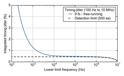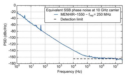 Menhir Photonics 具備極低位相噪聲和極高可靠度。圖1展示了250MHz重復(fù)頻率的MenHIR-1550 自由運轉(zhuǎn)時的典型位相噪聲。相位噪聲在10GHz載波(40階諧波)上測量。噪聲本底給出的累積時間抖動上限越為500as(阿秒)。