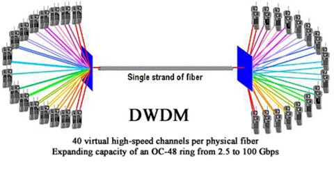 一根光纖如果只通過傳輸一個波長所負(fù)載的信號帶寬是有限的,可以通過在輸入端復(fù)用進多個波長的信號光,在輸出段把各個波長信號光分別處理(解復(fù)用),以此來大大拓寬光纖通信的帶寬,即波分復(fù)用WDM。