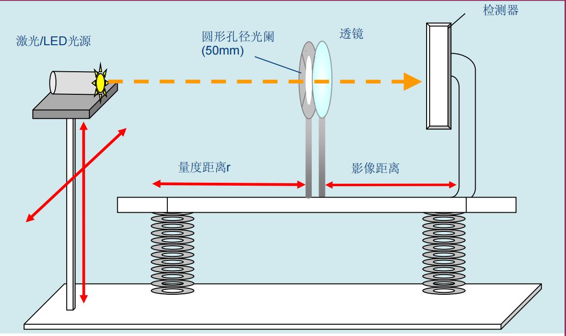 將光源、透鏡、光闌、光斑儀等固定于產(chǎn)品測試架上,并將其與測量透鏡水平對齊,如下圖搭建好測試光路。