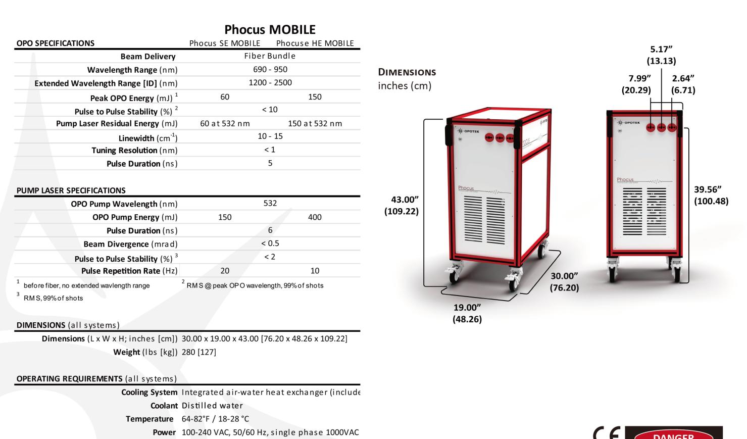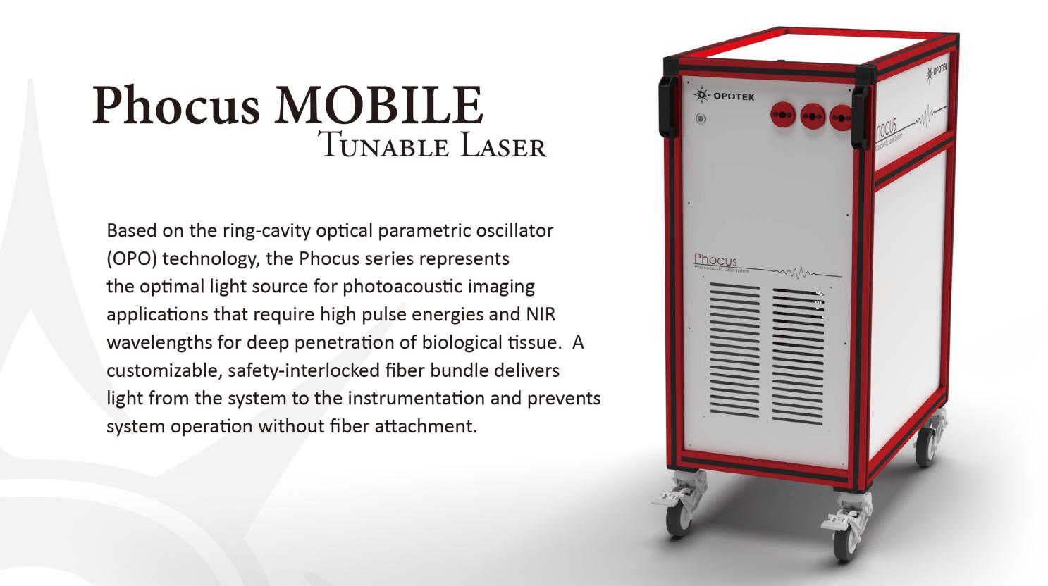 Phocus 為專門為光聲光譜設(shè)計的 OPO 激光器。Phocus 采用環(huán)形腔、I 類位相匹配,具備較高的近紅外轉(zhuǎn)換效率,滿足生物組織光聲成像的需求。Phocus Mobile 為一體式可移動高能量光聲光源,具備安全自鎖、光纖輸出等功能,可滿足臨床需求;Phocus Benchtop/ Phocus Inline 則更為適合實(shí)驗(yàn)室使用或系統(tǒng)集成。