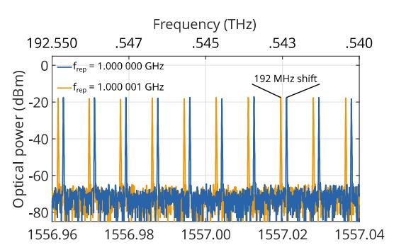 MENHIR-1550飛秒激光器具有穩(wěn)定兩個梳狀參數(shù)(fCEO和frep)的所有輸入。每個梳狀線的定義為f = fCEO + n frep,其中n 是一個接近200,000的整數(shù)值。圖3 描述了將重復(fù)頻率微小變化1 kHz與基準(zhǔn)重復(fù)頻率1.0 GHz的激光器相比的效果。橙色的跡線 相比藍(lán)色跡線向較高頻率(即波長較?。┢?,這是由于在恒定fCEO下,梳狀線間距稍微增加所致。