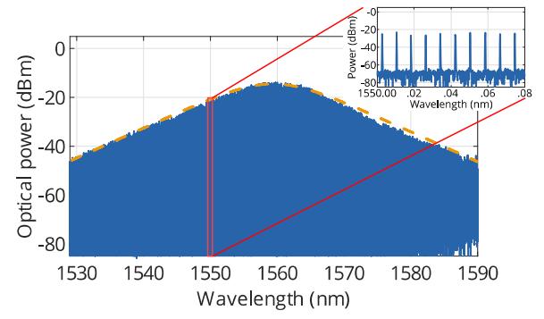 Aragon Photonics BOSA是基于受激布里淵散射(SBS)的高分辨率光譜分析儀。該技術(shù)是在光纖中創(chuàng)建了10 MHz的非常窄的純光濾波效果,用于掃描測試系統(tǒng),具有無與倫比的無雜散動態(tài)范圍(80 dB)。圖2顯示了當(dāng)MENHIR-1550直接插入BOSA時的寬波段頻譜:整體頻譜符合被動鎖模激光器的雙曲正割平方型脈沖形狀。放大頻譜的一部分(圖2中的紅色部分)可以揭示BOSA在分辨MENHIR-1550的單個梳狀線時的能力(1 GHz = 0.008 nm)。這得益于MENHIR-1550的高穩(wěn)定性,確保fCEO和frep這兩個定義輸出頻率梳組合的參數(shù)不隨時間變化。盡管單個梳狀線的固有線寬(<10 kHz)低于BOSA的10 MHz分辨率,但由于光譜線之間的頻率分離較大,可以評估梳狀線的所有光譜線。