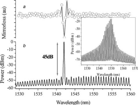 圖6. a.激光腔鏡間衰減系數(shù)曲線,b.離散模半導(dǎo)體激光器實現(xiàn)單縱模輸出