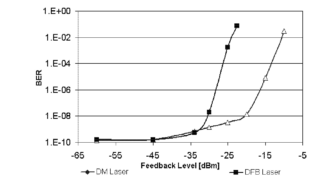 離散模工藝結(jié)構(gòu)還可以抑制反饋回F-P激光腔鏡內(nèi)的激光干擾,帶來的好處是允許客戶使用規(guī)格更低的光隔離器,甚至往往不加光隔離器也可以正常工作。(如圖9)可見,和DFB分布反饋式半導(dǎo)體激光相比,同樣用于光纖通信應(yīng)用,在同等情況下,如果希望達到同等的BER 1.E-8(即百萬分之一的比特誤碼率),DM離散模半導(dǎo)體激光器可允許高達-20dBm的反饋激光,而DFB分布反饋式半導(dǎo)體激光器只能允許-30dBm的反饋干擾激光強度。