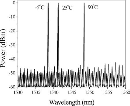 圖7. DMLD離散模半導(dǎo)體激光器在不同溫度下的輸出光譜,可見變溫條件下仍保持單模輸出且邊模抑制比好于40db