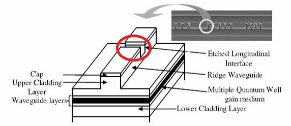 請參考(如圖1.)這是一個標(biāo)準(zhǔn)的F-P半導(dǎo)體激光器,Eblana Photonics公司擁有的這種離散模半導(dǎo)體激光器制備工藝,是在F-P半導(dǎo)體激光器脊波導(dǎo)上一系列特定的位置,刻蝕上特定間距和深度的溝槽(如圖2)。