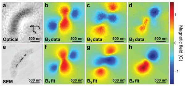 圖5。(a)趨磁細菌的光學(xué)圖像。(e)同一細菌的SEM圖像,其中磁性納米粒子(黑色)清晰可見。(b,c,d)磁場x, y, z分量由NV金剛石光學(xué)探測磁共振測量確定。(f,g,h)實測場分布的數(shù)值擬合(來自[g])。