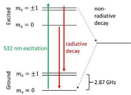顧名思義,氮空位色心 (NV-Nitrogen-Vacancy center)(圖2)是由一個氮原子取代金剛石中的一個碳原子,然后捕獲周圍的一個空穴形成的。在NV位上懸浮鍵的電子通過雜化產(chǎn)生自旋-1系統(tǒng),具有明確的能量狀態(tài)和較長的自旋壽命,即使在室溫下也是如此。這樣就可以通過磁共振的自旋操控技術(shù)在精確定時的微波磁場下來控制NV點的自旋狀態(tài)。由于它的能級對外部磁場和電場都很敏感,使得這種自旋狀態(tài)可以作為外部環(huán)境的傳感器。