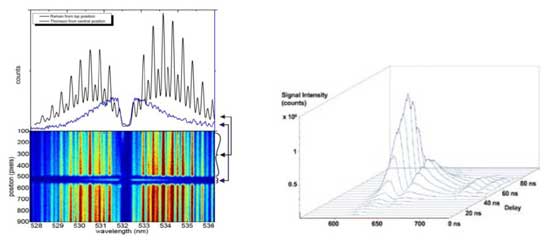 通常來(lái)講,等離子環(huán)境具有高動(dòng)態(tài)和瞬時(shí)的特性,所以成像及光譜信息要在數(shù)十納秒(甚至皮秒量級(jí))的時(shí)間內(nèi)進(jìn)行捕獲。此時(shí)普通探測(cè)器無(wú)法提供這么高的時(shí)間分辨率,像增強(qiáng)型探測(cè)器(ICCD/ICMOS)是較為合適的探測(cè)器,它的像增強(qiáng)器光陰極門(mén)控能提供納秒量級(jí)的時(shí)間閘門(mén)。特定波長(zhǎng)的帶通可以篩選出特定化學(xué)結(jié)構(gòu)(分子,原子團(tuán),原子,離子等)的特征光譜,濾光片只需要在ICCD相機(jī)前安裝好,就可以用于2D PLIF或者LIF圖像的采集。