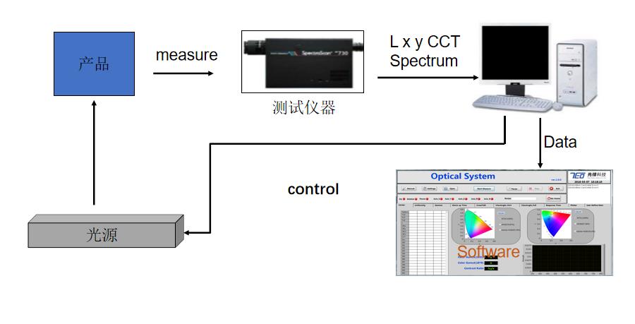 該系統(tǒng)是集成光譜儀、反射光源、透射光源、CCD、高精度模組、運(yùn)動(dòng)控制軟件為一體的自動(dòng)化測(cè)試系統(tǒng),應(yīng)用于車(chē)載玻璃的反射率,透過(guò)率測(cè)試及獲取相應(yīng)狀態(tài)下的色坐標(biāo)。
