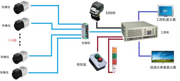 熱像儀通過交換機(jī)連接到工控機(jī)網(wǎng)口,掃碼槍連接到工控機(jī)485接口,按鈕盒柱燈連接到工控機(jī)I/O板,工控機(jī)連接兩個(gè)顯示器。