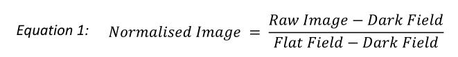 使用ImageJ軟件對(duì)圖像記錄并進(jìn)行處理,對(duì)每一個(gè)數(shù)據(jù)組、平均暗場(chǎng)信號(hào)、平場(chǎng)校正信號(hào)以及樣品成像進(jìn)行編譯。首先從一組參考的背景圖中獲取出平均背景信號(hào);為了估算出平場(chǎng)信號(hào),我們從每一個(gè)平場(chǎng)信號(hào)中減去平均背景,平場(chǎng)信號(hào)減去背景而后進(jìn)行歸一化和平均處理這樣就可以得到平均平場(chǎng)校正信號(hào);為了得到有效的目標(biāo)信號(hào),對(duì)所有的目標(biāo)圖像進(jìn)行背景扣除、歸一化處理而后除以平均平場(chǎng)信號(hào)。調(diào)整對(duì)象堆棧的大小可以改變相機(jī)曝光時(shí)間。通過(guò)將平均目標(biāo)圖像除以平場(chǎng)信號(hào),這樣可以使增益帶來(lái)的變化以及固定模式噪聲最小化【7,12】。最后處理得到的圖像再進(jìn)一步分析。