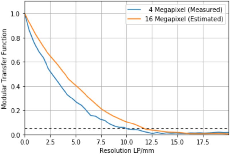 通過(guò)評(píng)估不同位置的平均對(duì)比度,x,y方向的對(duì)比度可以分辨出區(qū)別如圖4所示。值得注意的是,雖然平均對(duì)比度在X方向上有1.1%的微小變化,在Y方向上有3.7%的變化。在計(jì)算的MTF曲線中也觀察到這種XY依賴關(guān)系,如圖7所示。這可能是由幾個(gè)因素造成的,需要進(jìn)一步研究。最終計(jì)算出的MTF曲線(圖8)是通過(guò)取中心處的X和Y MTF曲線的平均值來(lái)計(jì)算的。