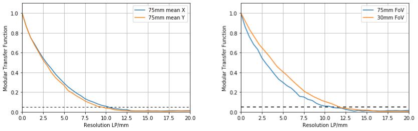 Figure 5: 不同尺寸線寬 、不同積分時(shí)間75mm視場(chǎng)下對(duì)比度 Figure 6: 75mm不同分辨率條件下75mm視場(chǎng) MTF曲線(5、10、30、300s曝光時(shí)間)