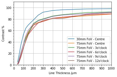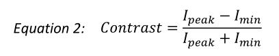 處理圖像后,在第一和第二組線對(duì)(25-1000um)成像中重現(xiàn)出多條線陣的輪廓。同時(shí)對(duì)于不同線對(duì)的尺寸用方程二進(jìn)行對(duì)比度計(jì)算。計(jì)算圖像的MTF模式傳遞函數(shù)邊緣效應(yīng),使用了ImageJ軟件插件,針對(duì)邊緣ROI區(qū)域進(jìn)行定義分析。