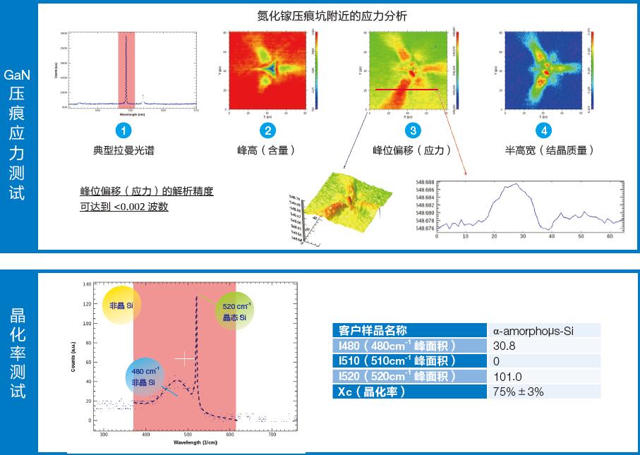 可直觀給出應(yīng)力屬性(拉力/ 張力),針對(duì)特種樣品,可直接計(jì)算應(yīng)力大小,應(yīng)力均勻性分析 (需額外配置電動(dòng)位移臺(tái)), 應(yīng)力解析精度0.002cm-1 |