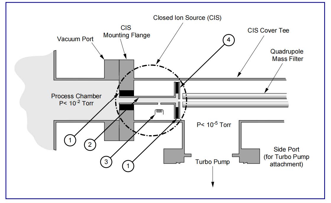 在需要測(cè)量10−4和10−2Torr之間的壓力的應(yīng)用中,通過用封閉離子源(CIS)采樣系統(tǒng)取代傳統(tǒng)的OIS PPR配置,可以顯著減少背景和工藝氣體干擾的問題。一個(gè)通用的CIS設(shè)置的橫截面如圖3所示。
